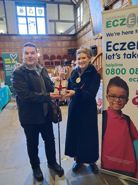 The Deputy Mayor of Guildford, Jane Tyson, presents the winner of the National Eczema Society’s Christmas card competition, Mariusz Czajkowski, with his prize.