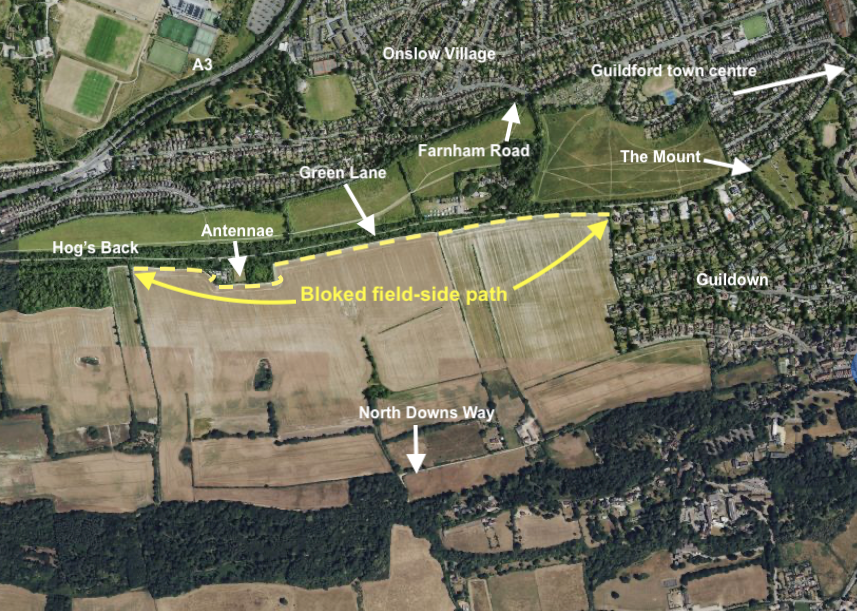 The issue of the blocked fieldside path on the south side of the Hog’s Back came to a head at the Artington Parish Council meeting last night (March 9).