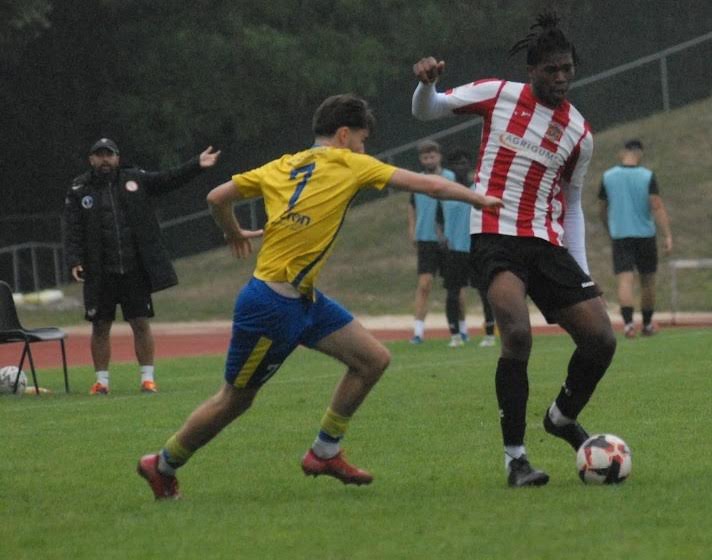 Freddie Robins won a midfield challenge. The ball went forward via Kai Zini who gave Reid Solanki a shooting chance, but his effort went just wide. Twice in the final seconds of the half Kasey Taylor again came to City’s rescue.
