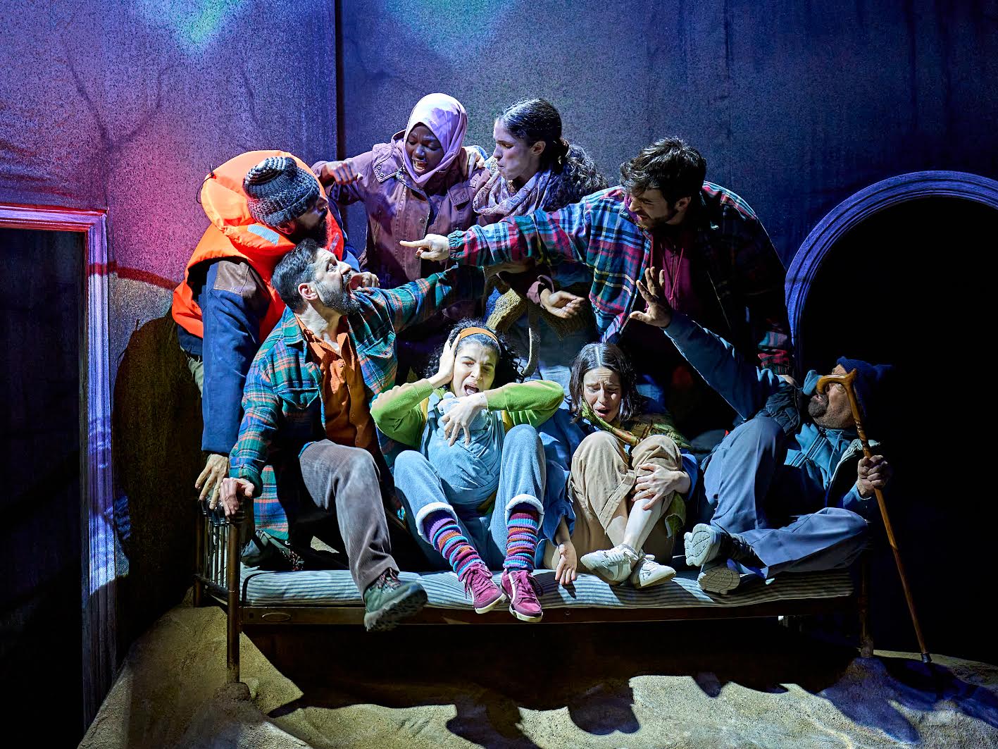 There is a bed, a chair and a hatch door, all incorporated into what looks like rocks, and this forms a perfect backdrop to the numerous locations which range from Aleppo in Syria, to the UK Border, a GP Surgery and a Greek Island amongst others.