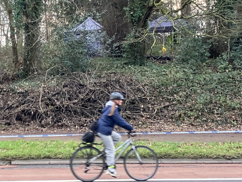 A cyclist passes the scene of the crime where forensic tents were erected in Peacock Wood, by Parkway.