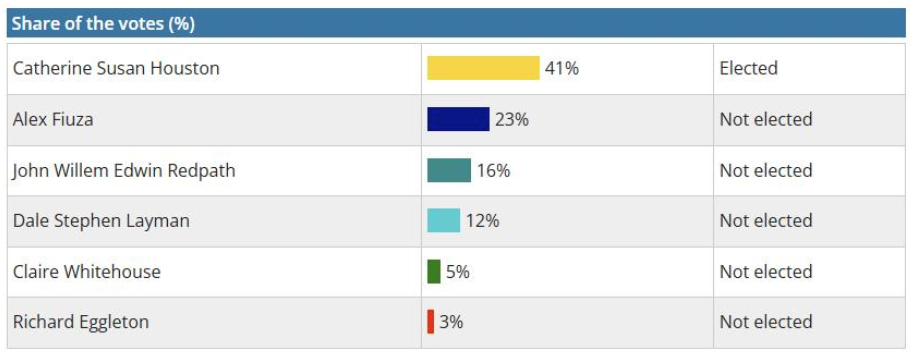 Guildford South East by-election result. It was an emphatic win for Catherine Houston securing 41 per cent of the vote.