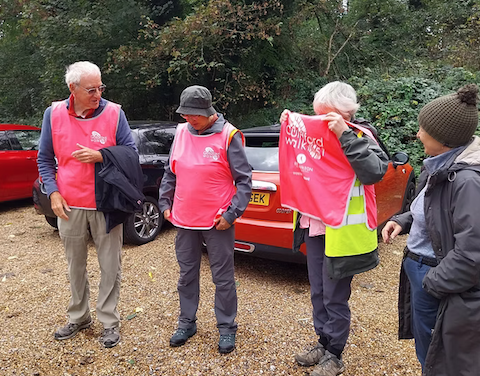 Walk leaders from Guildford Health Walks getting ready for a stroll with their Walkfest tabards on.