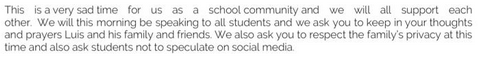 Extract of letter, sent on January 20, from the headteacher to parents of children at All Hallows School, Farnham, which Luis Guembes attended.