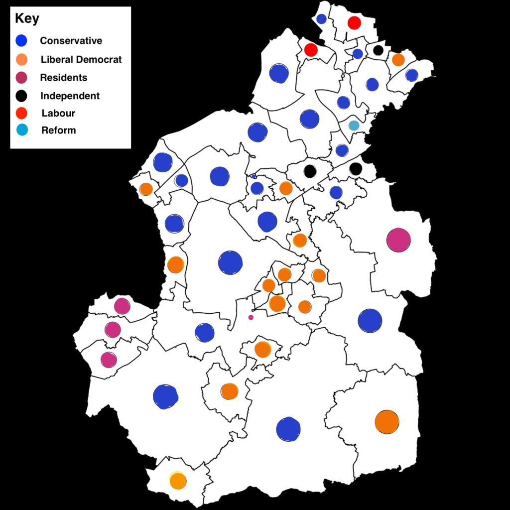 Back in 2021, the Conservatives held a commanding position, winning 47 of 81 seats. The Liberal Democrats secured 14, while Residents’ Associations and independents held 16 seats combined. The Labour Party and the Green Party of England and Wales took two seats each.
