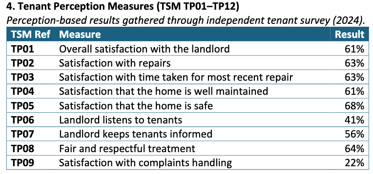 The GBC webpage referred to, “Tenant Satisfaction Measures (TSMs),” shows an overall satisfaction level of 61 per cent for the year 2024-2025 (see table below), so an increase of 8 per cent would mean it is now measured at 69 percent.”