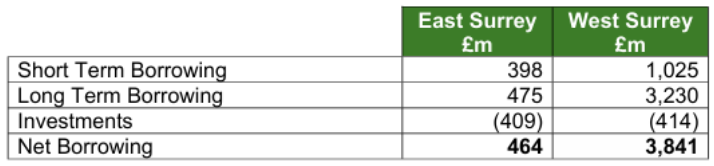 Council debt in West Surrey stands at a total of around £4.2 billion, or £3.8 billion net once you take into account the value of investments. In East Surrey it’s just under £0.5 billion.