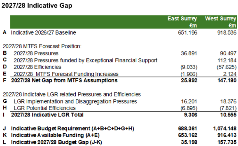 West Surrey will face a budget shortfall, in its first year, of £158 million, which amounts to 17 per cent of its baseline budget. East Surrey will face a budget shortfall of £35 million, which amounts to just 5 per cent of its baseline budget.