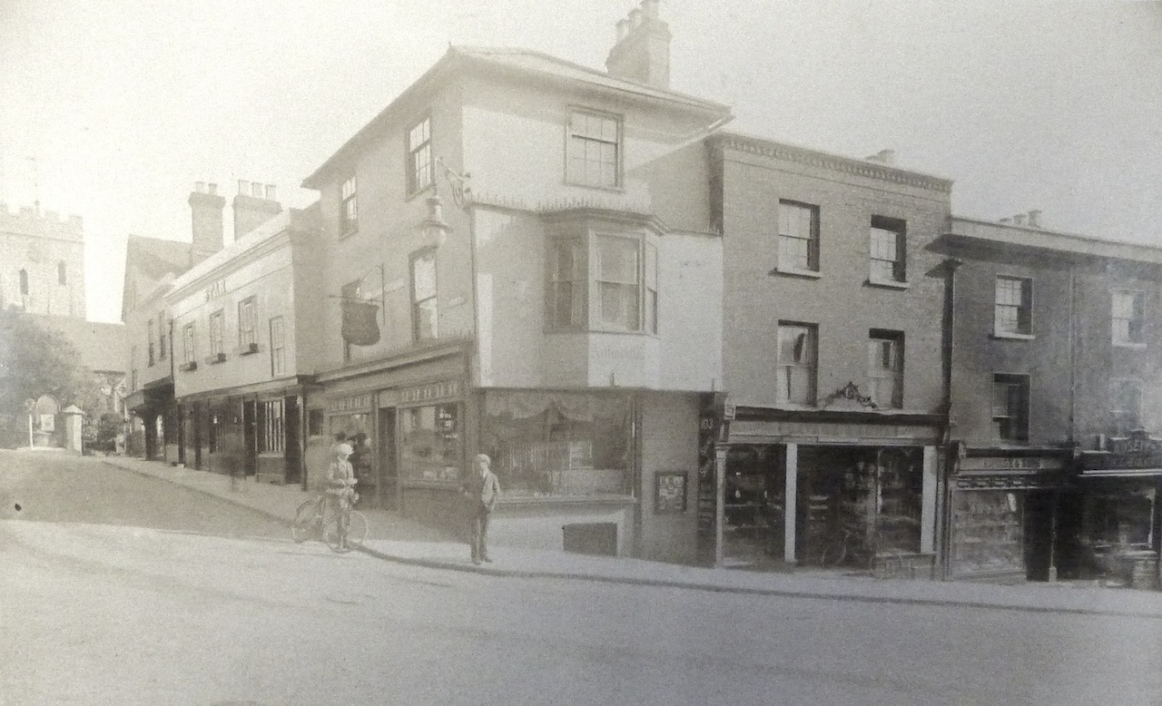 Savage’s barbers was at 103 High Street (before renumbering), one down from the building on the corner with Quarry Street. This picture, from the collection at the Guildford Institute, dates to about 1922.