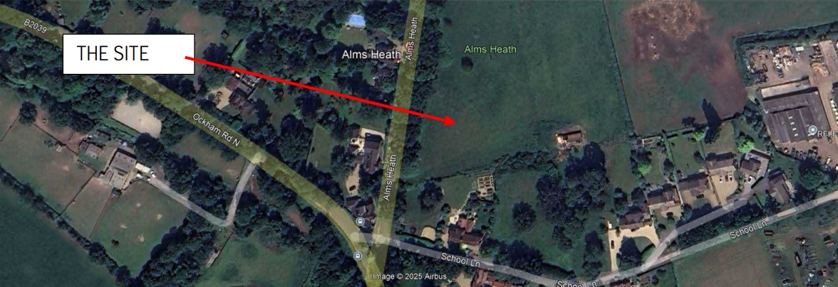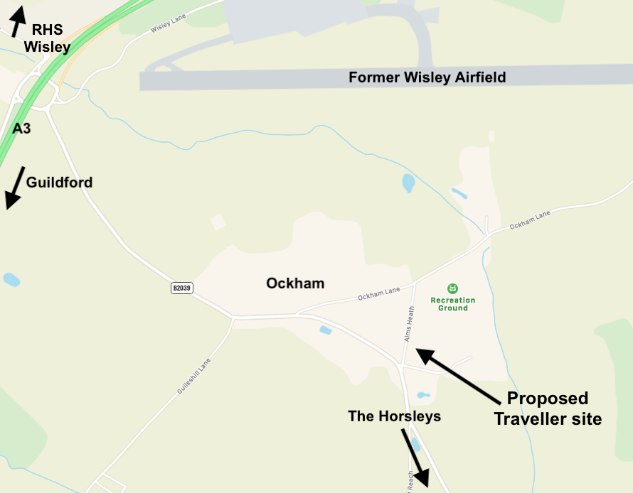 The proposal seeks part-retrospective planning permission to turn land off Alms Heath and School Lane in Ockham into a permanent traveller site with six pitches for families.