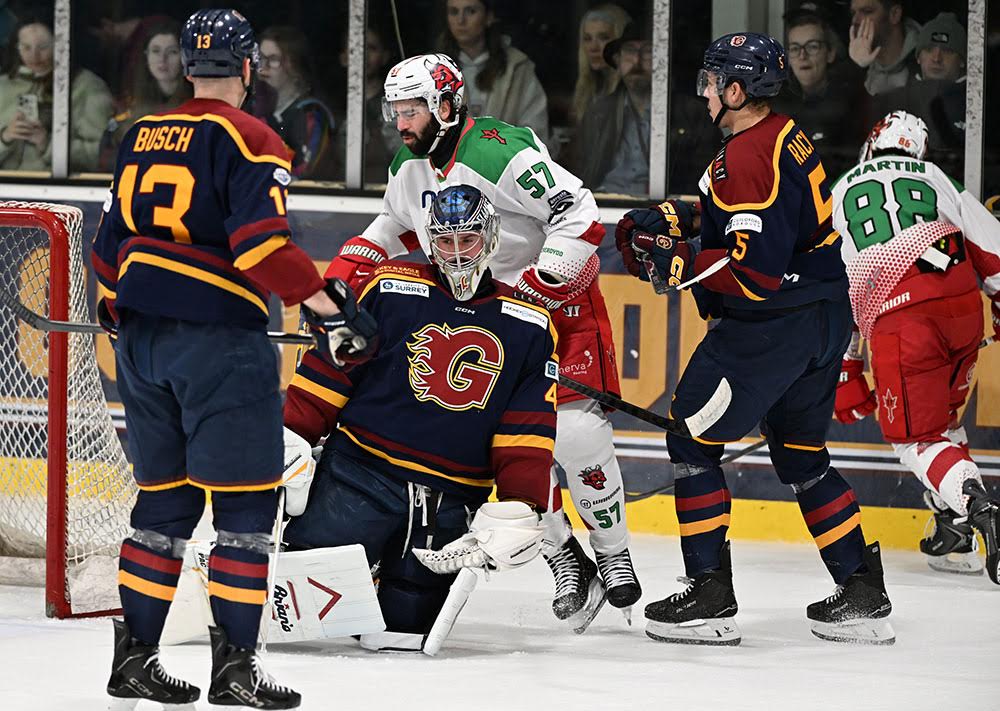 Despite more than a minute of five on three in Flames favour early, Justin Fazio and Christian Stoever were able to force a scoreless opening set with the former making 17 saves while the latter stopped seven through 20 minutes of play.